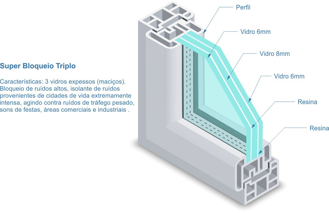 Aplicado em locais com extremas emissões de ruídos vindo de várias fontes, tais como: trânsito muito pesado, sons de baile funk, barulho de motos e outros. Composição de janelas acústicas com vidrossuper bloqueio triplo: 01 vidro de 6mm + laminação + 1 vidro 8mm + laminação + 1 vidro 6mm - Total 18mm.