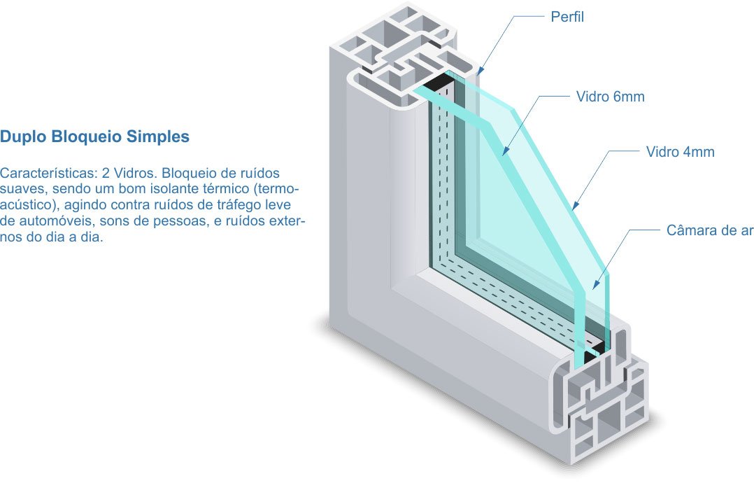 Indicado para locais onde há uma grande incidência de ruídos leves, porém intensos, como transito leve, barulhos de conversas de pessoas e ruídos da rua. Composição de janelas acústicas com vidros duplo bloqueio simples: 01 vidro 6mm + câmera de ar + 1 vidro de 4mm. - Total 10mm.